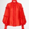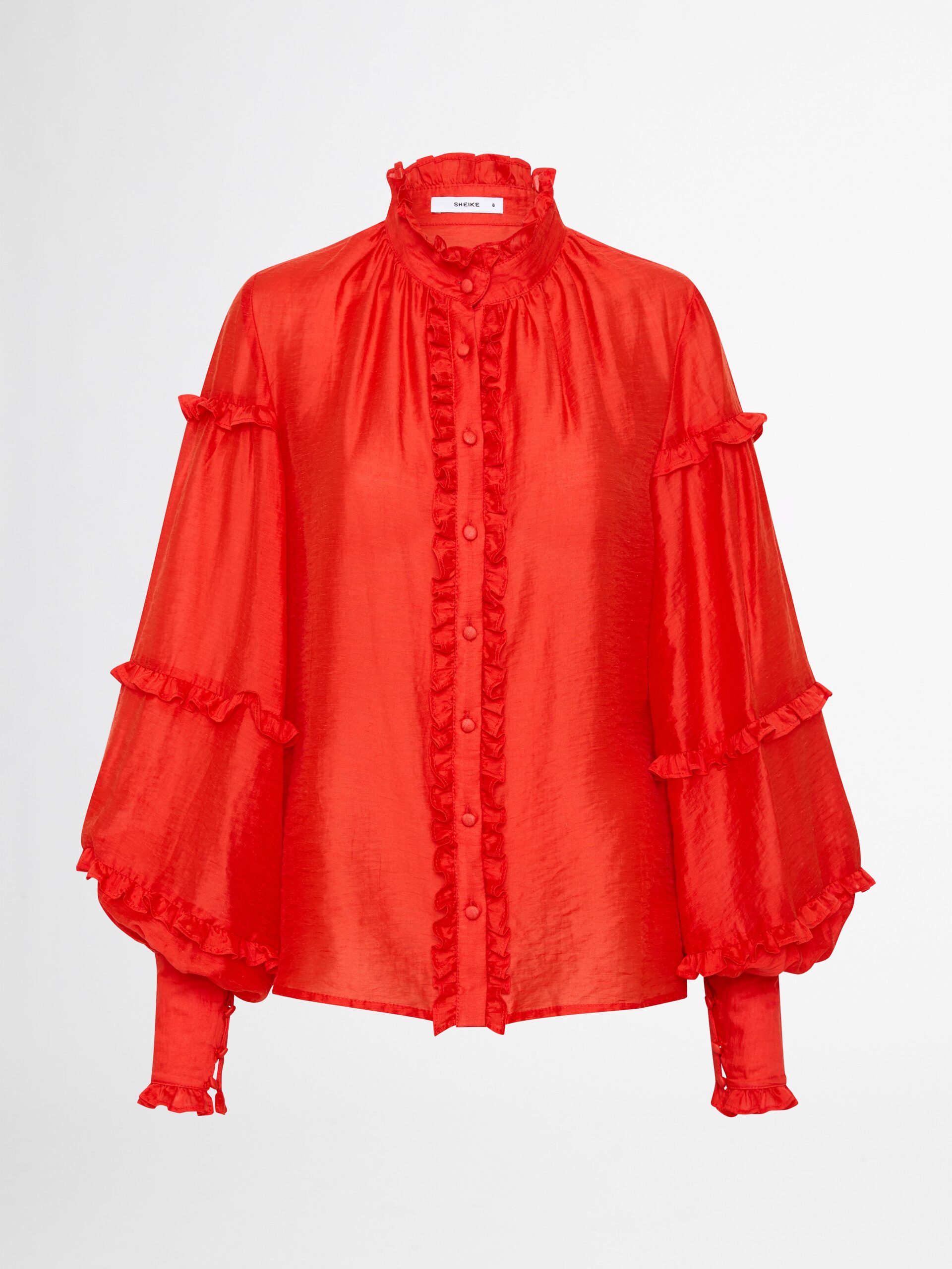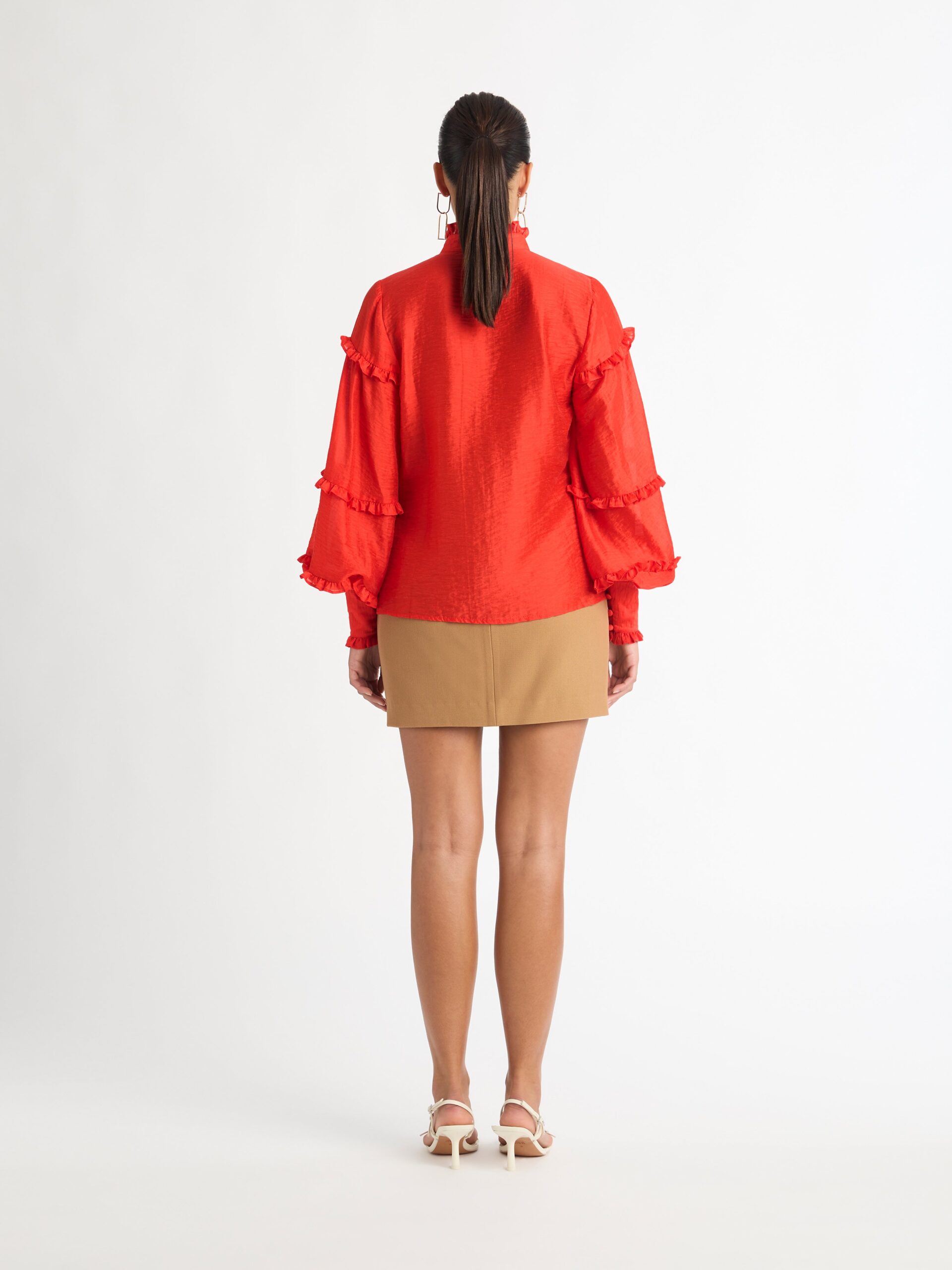 Demand their attention in decadent red. Introducing the Highfield Blouse – showcasing a relaxed fit, balloon sleeves, ruffle detailing and front placket button closure. Pair with our Bethany Skirt and Tori Earrings to complete the look.?