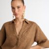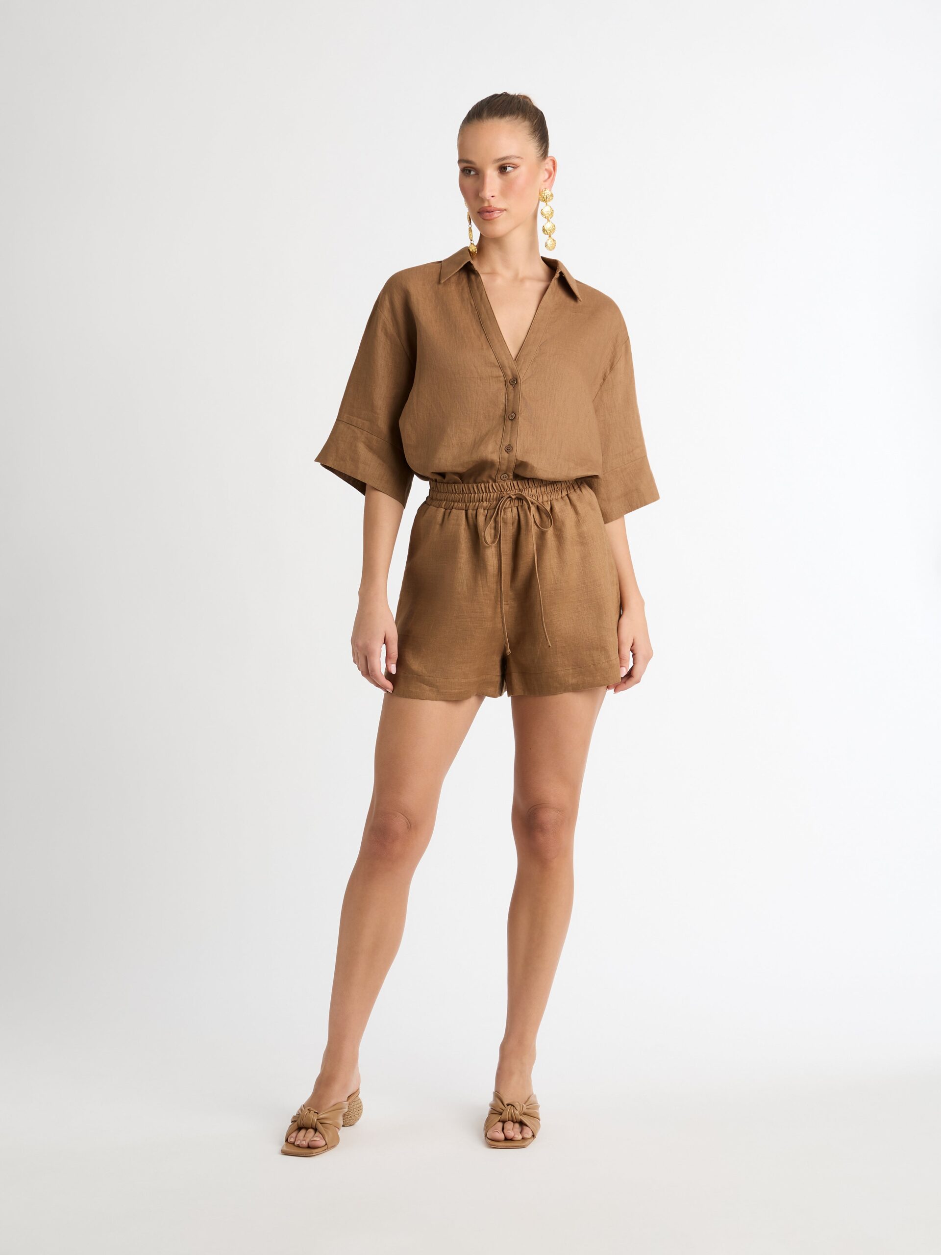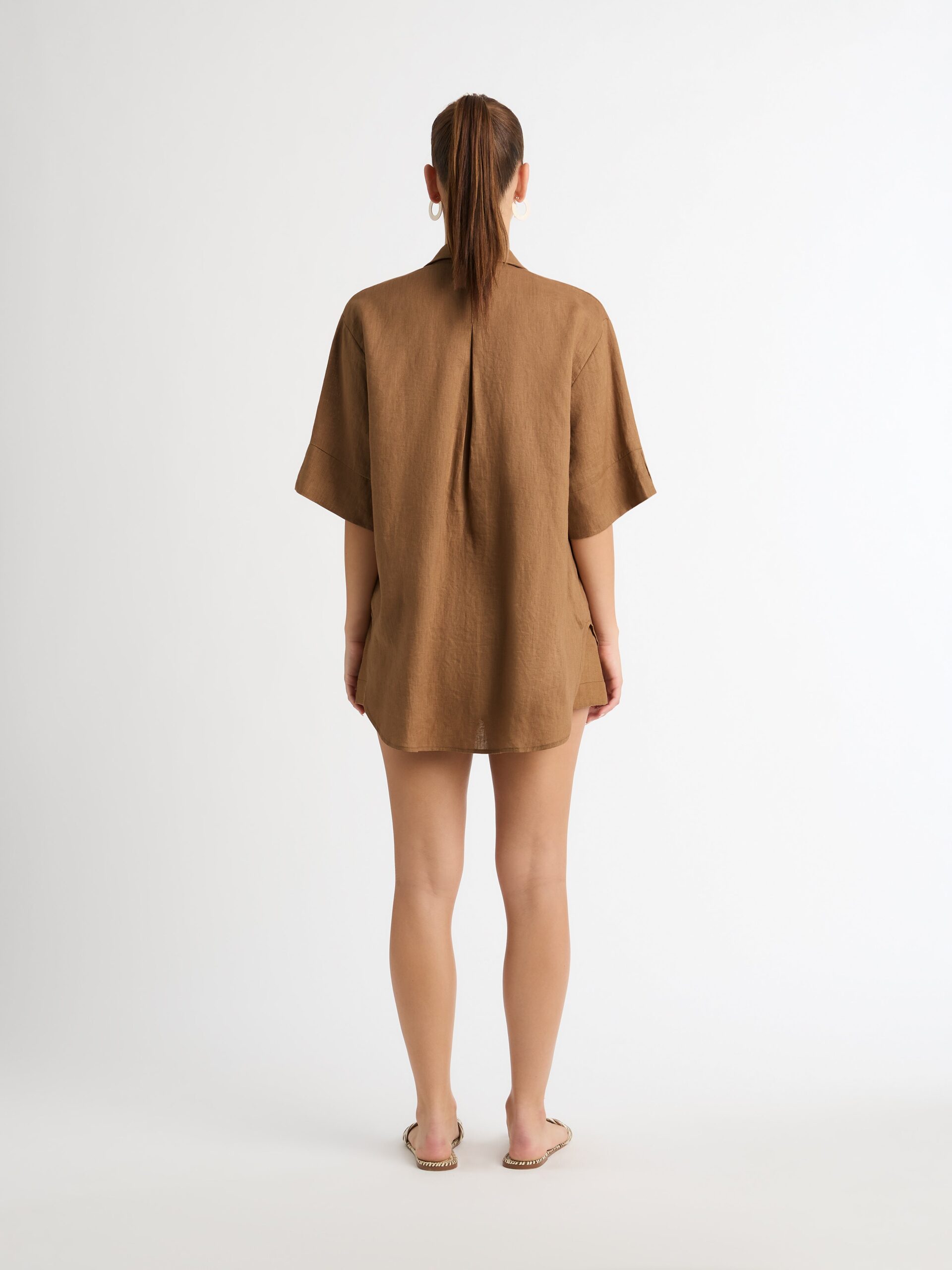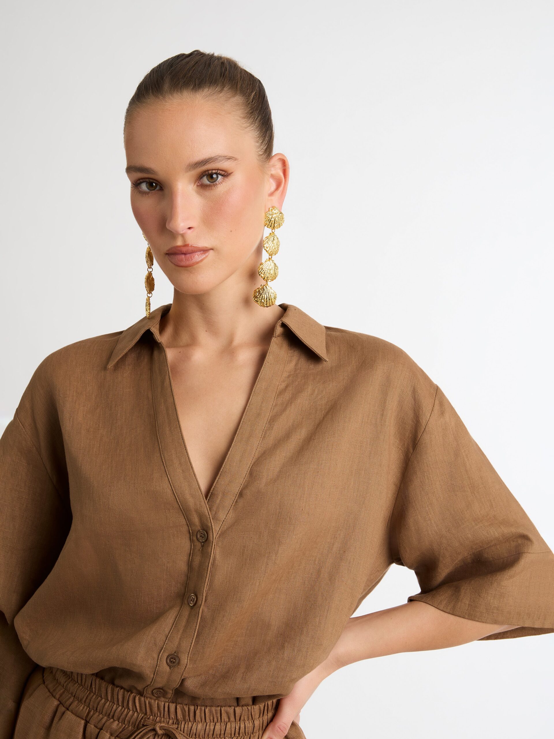 Introducing?the Leo Linen Shirt – showcasing a relaxed?fit, V neckline and short sleeves. Pair with our matching Leo Linen Short and Shoreline Earrings to complete the look.?