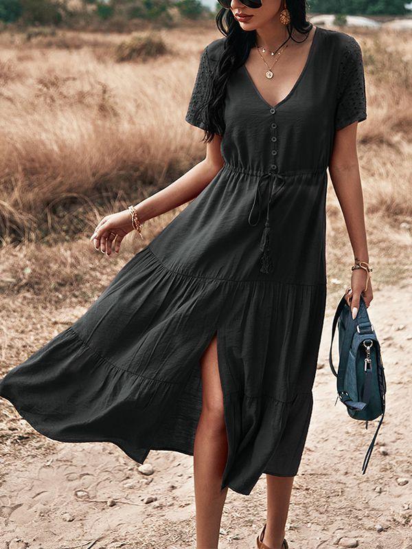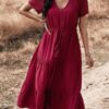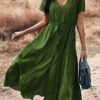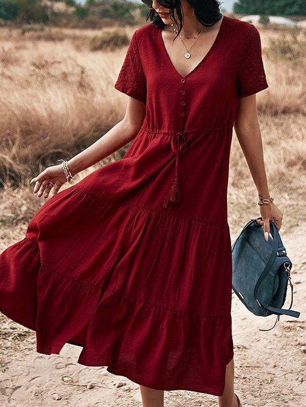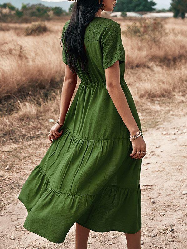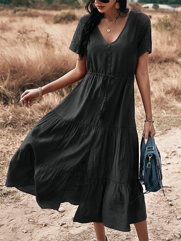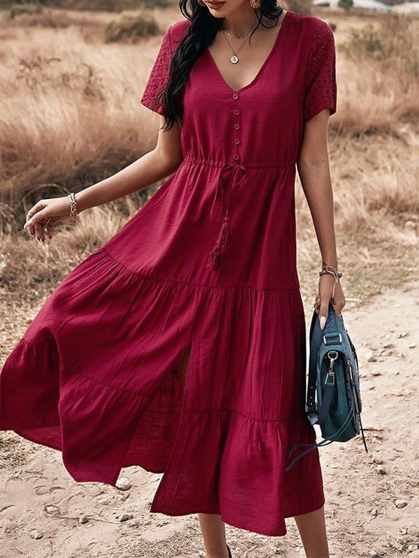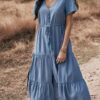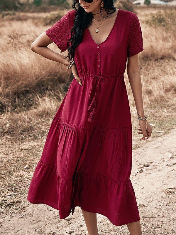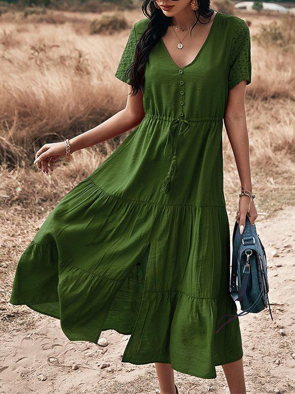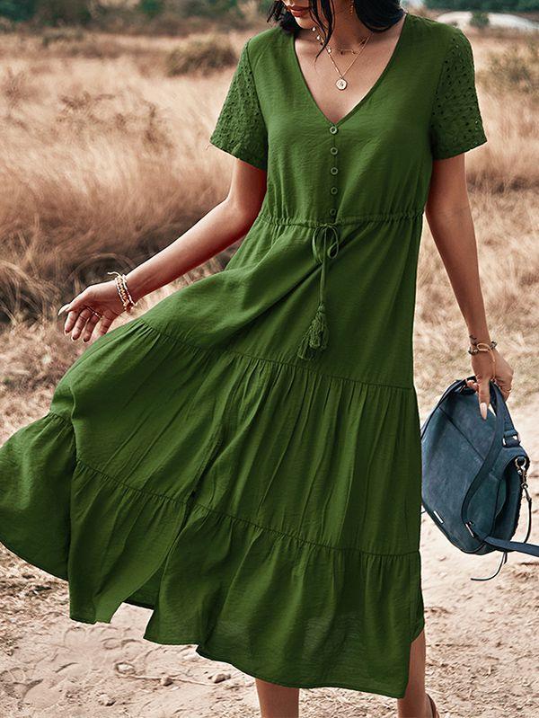 - Solid color button v neck tiered midi dress