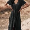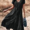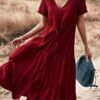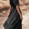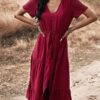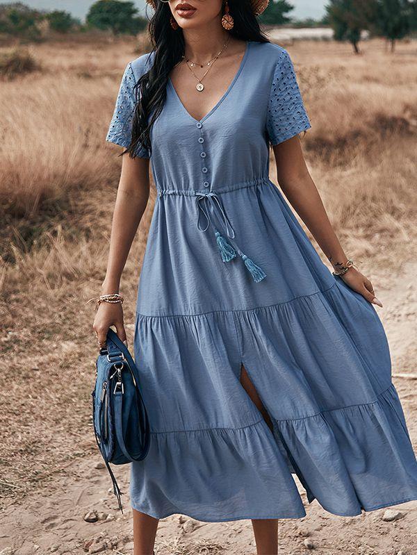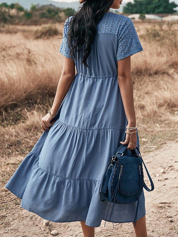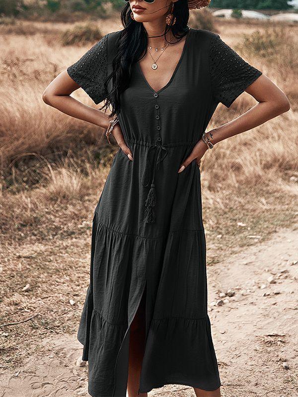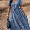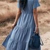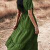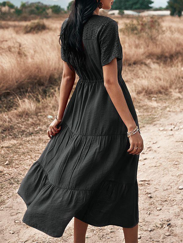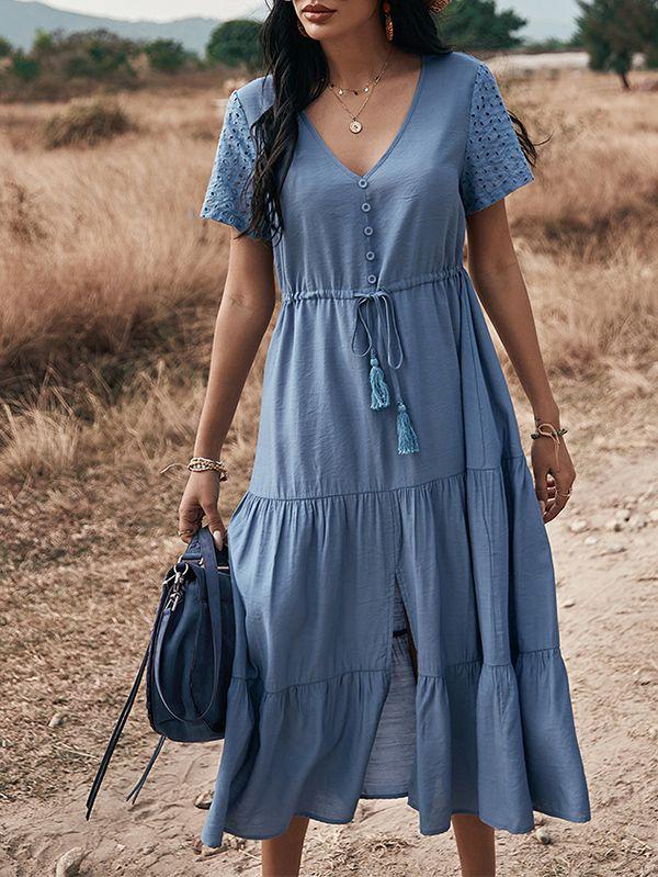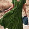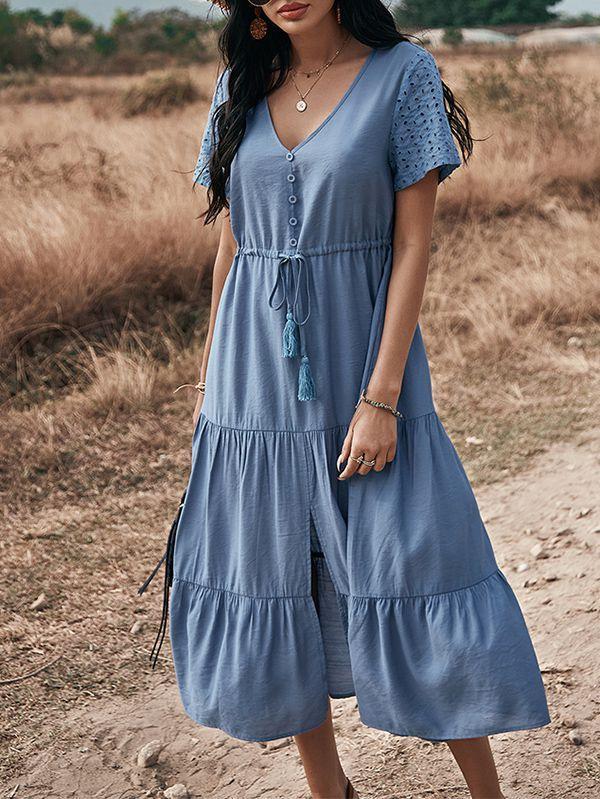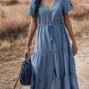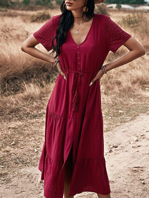 - Solid color button v neck tiered midi dress