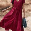 - Solid color button v neck tiered midi dress