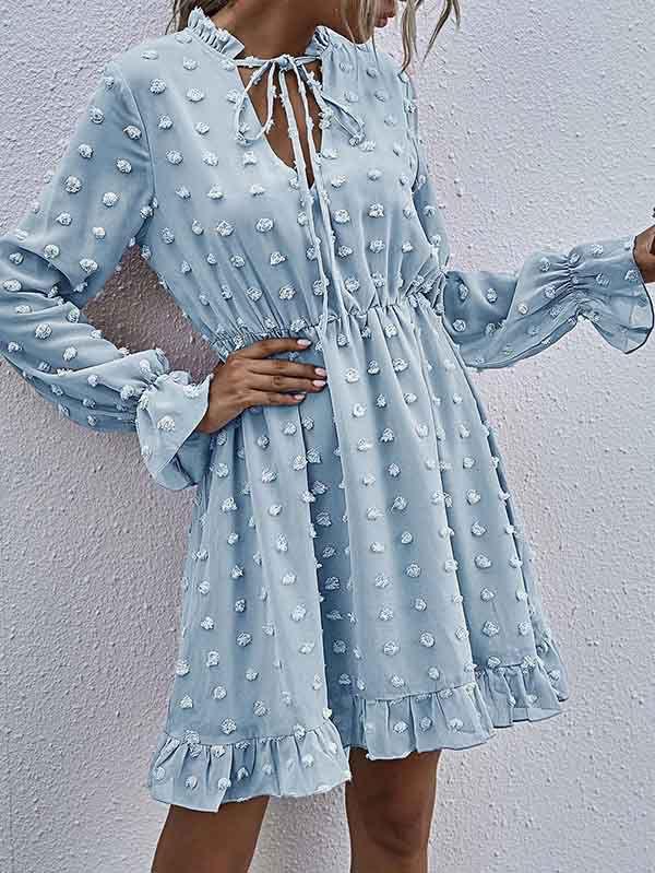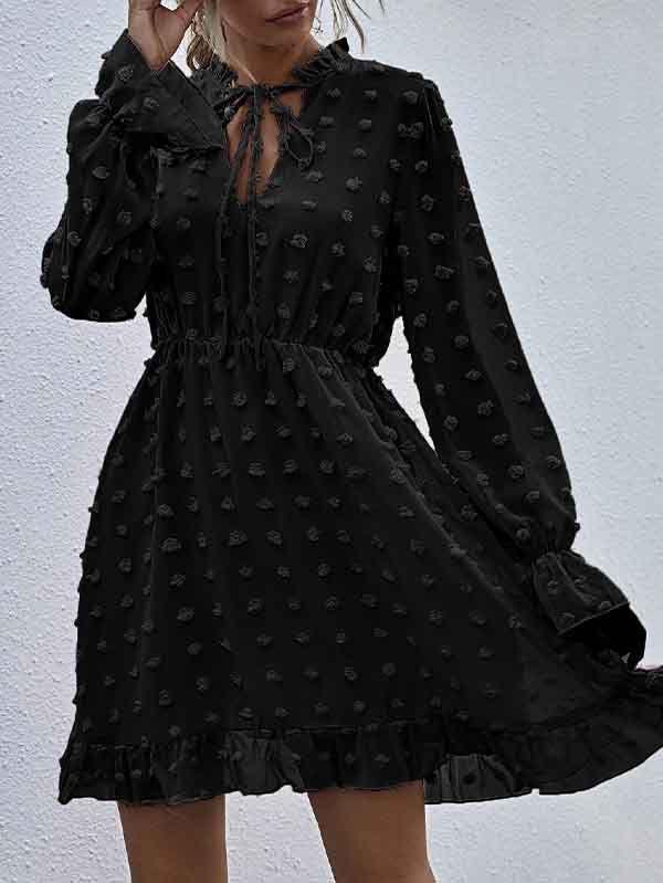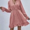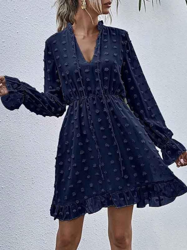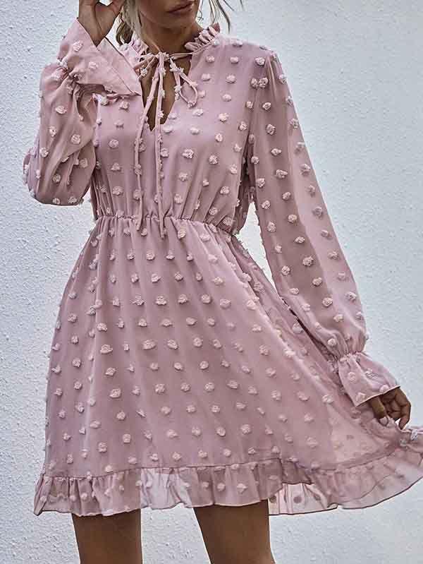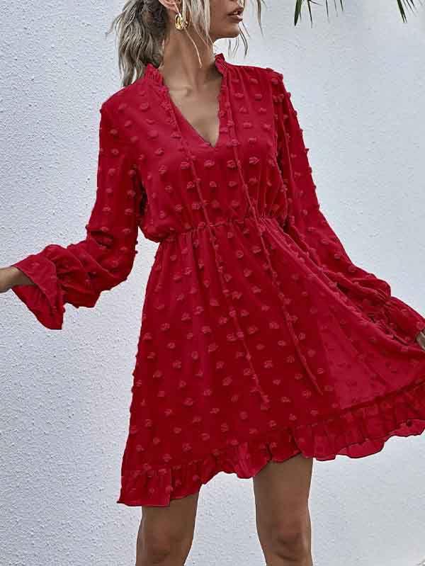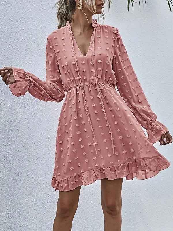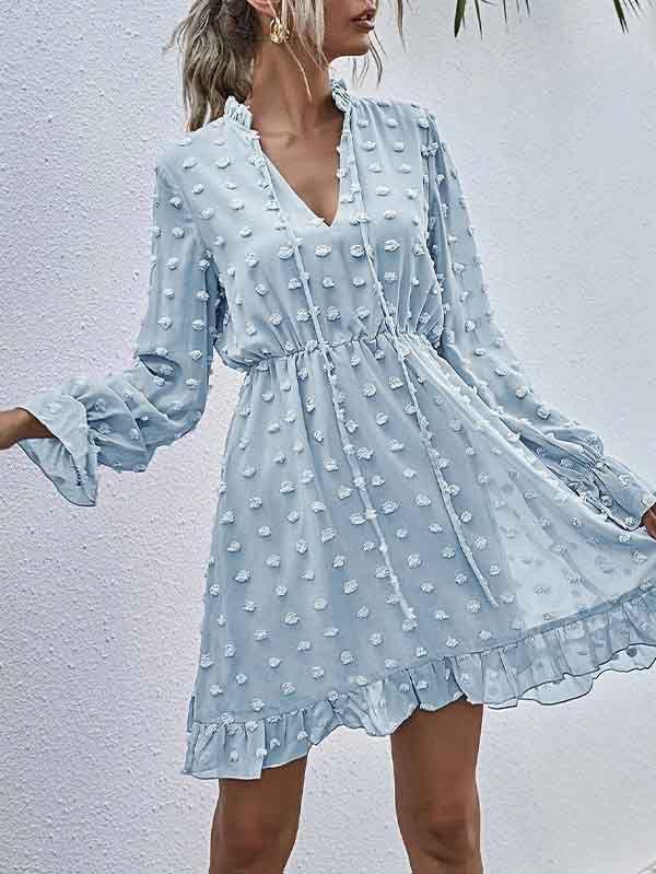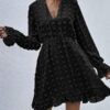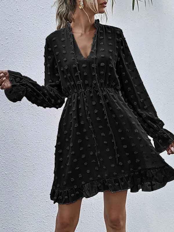 - V neckline flowy dress with long sleeves, swiss dot throughout, ruffle detail at hemline
