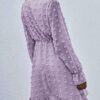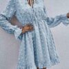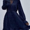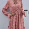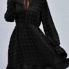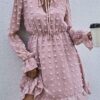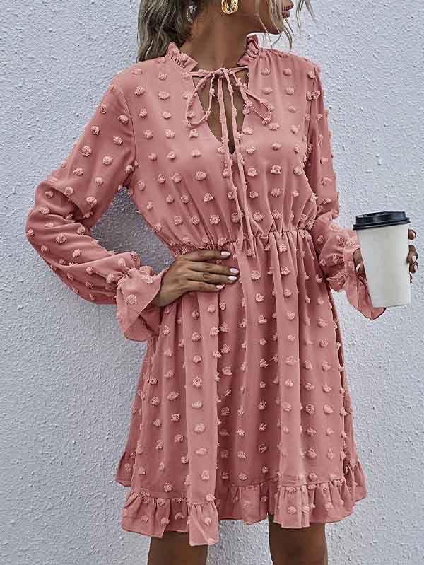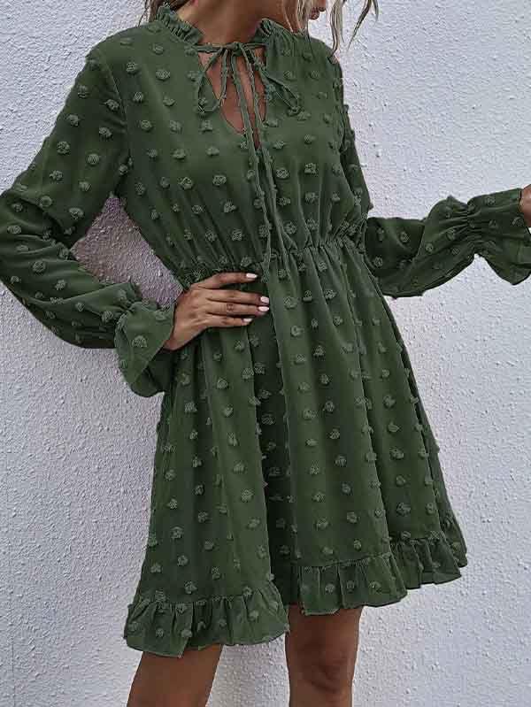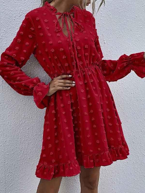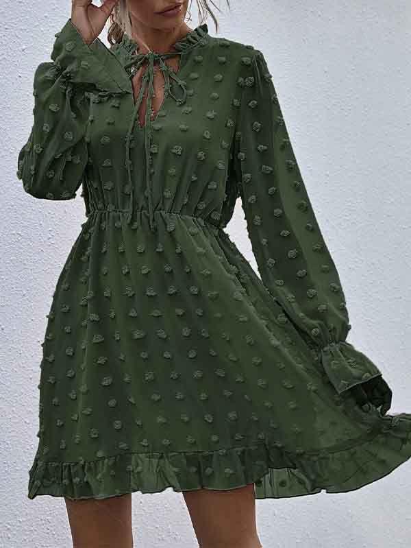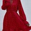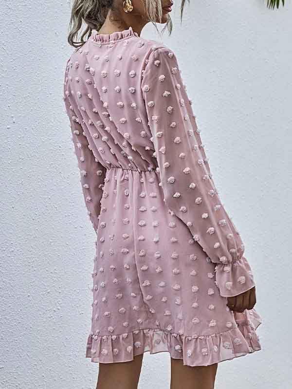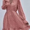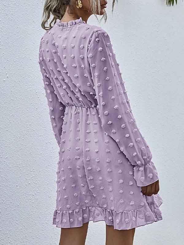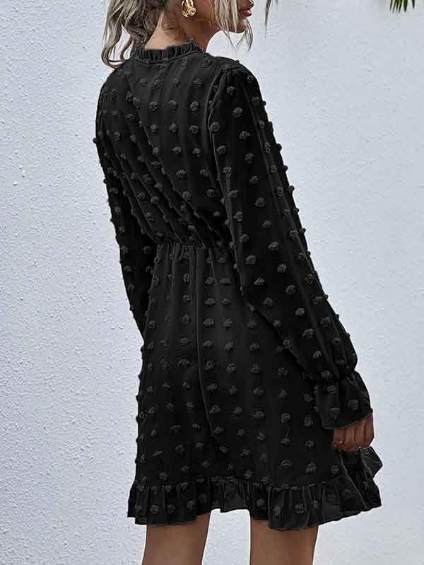 - V neckline flowy dress with long sleeves, swiss dot throughout, ruffle detail at hemline